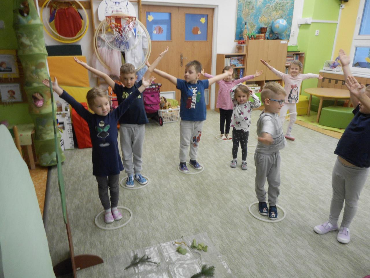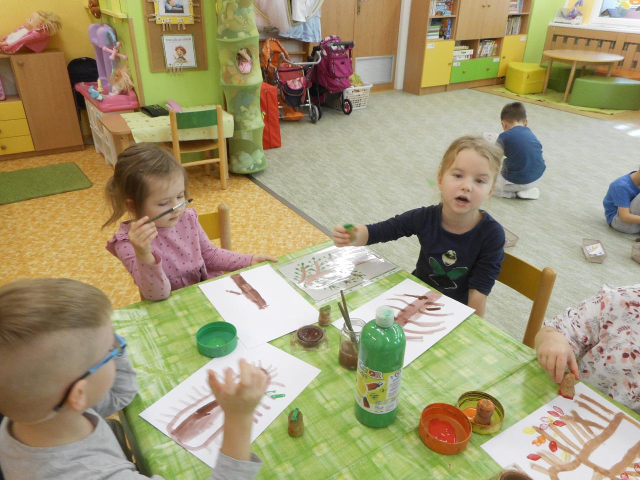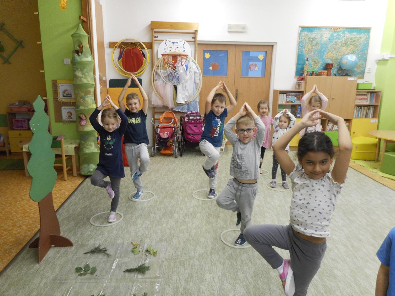 Děti se v rámci tématu seznámili s různými druhy stromů. Poznávaly jejich plody, listy, pozorovaly změny barev a učily se básničky, písničky. Jeden den se děti také seznámily s doktorem stromů - datlem, kůrovcem a poslouchaly nahrávky lesa.