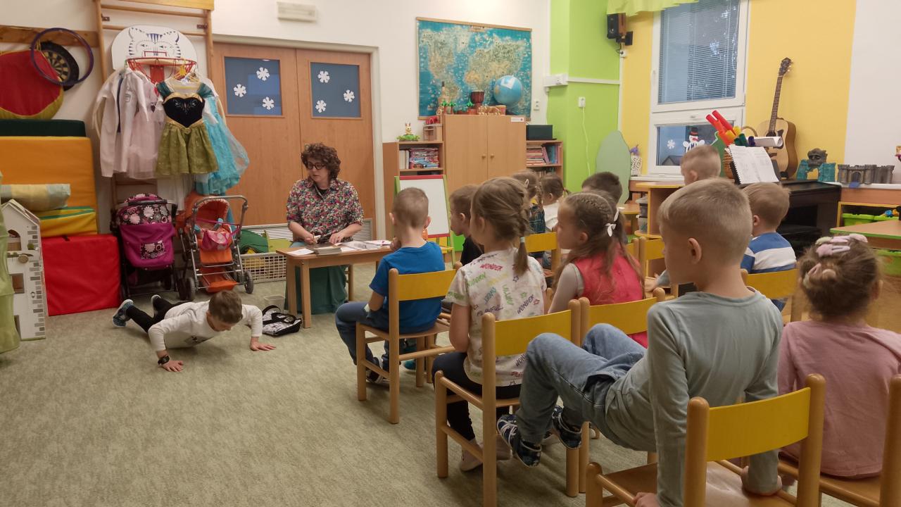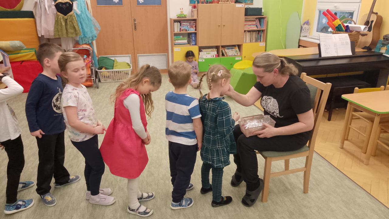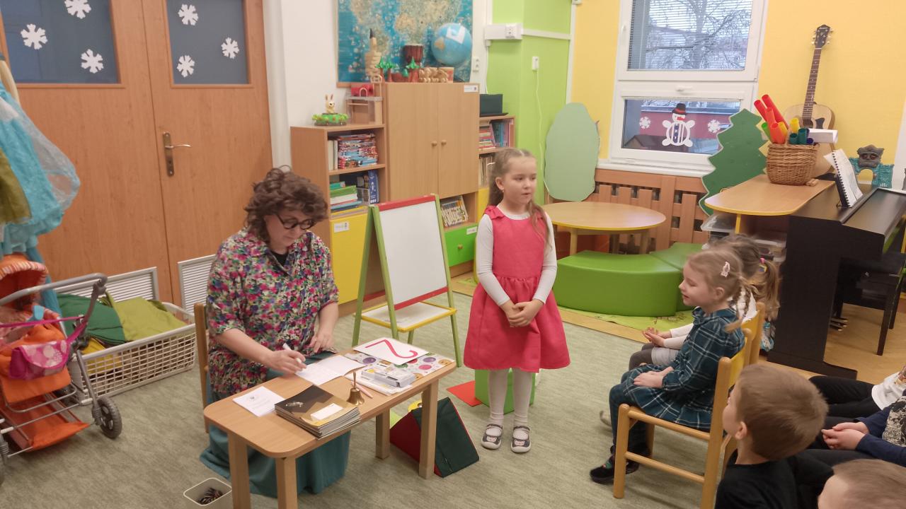 Jak to vypadá ve škole s paní učitelkou Kadrnožkovou. Děti měly tyto vyučovací předměty: český jazyk, matematika, hudební nauka a tělocvik. Poté jsme oslavili narozeniny paní učitelky Olinky.