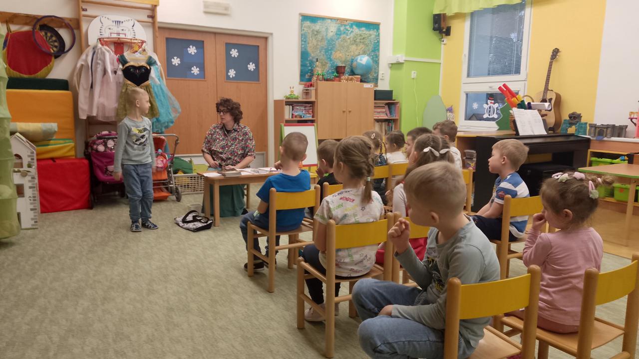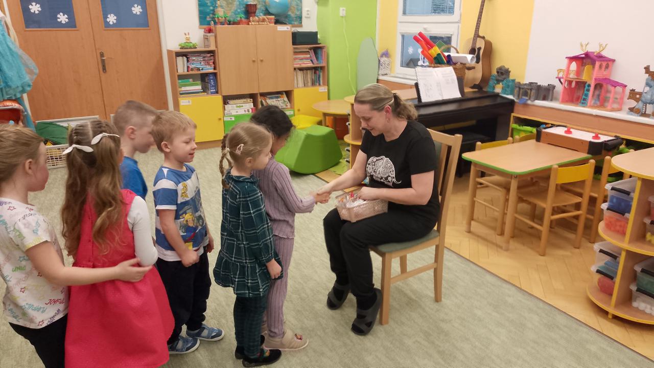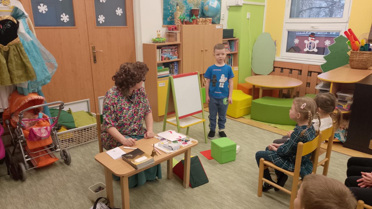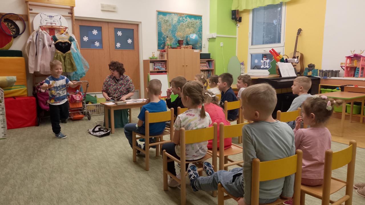 Jak to vypadá ve škole s paní učitelkou Kadrnožkovou. Děti měly tyto vyučovací předměty: český jazyk, matematika, hudební nauka a tělocvik. Poté jsme oslavili narozeniny paní učitelky Olinky.
