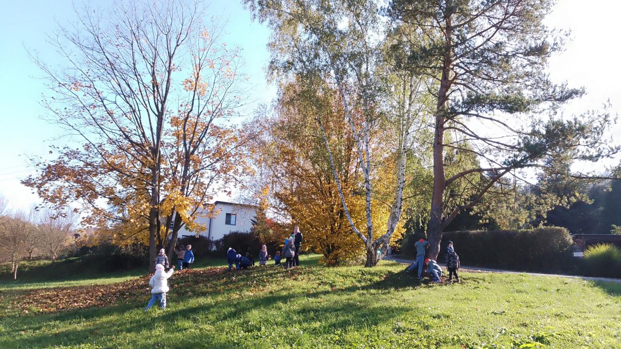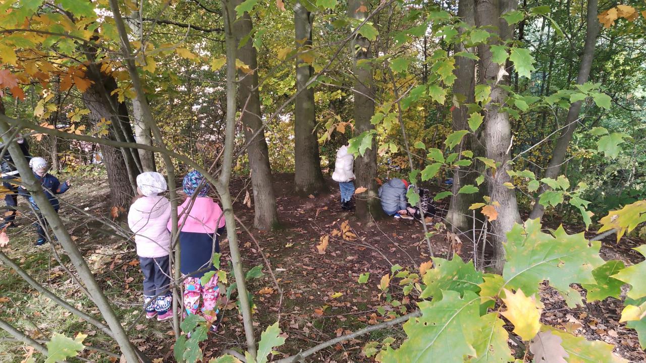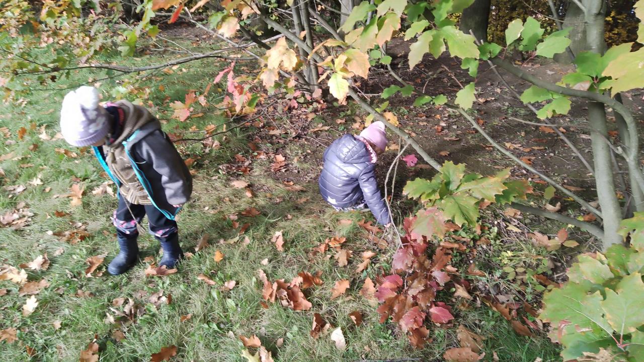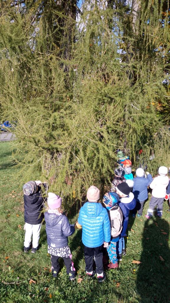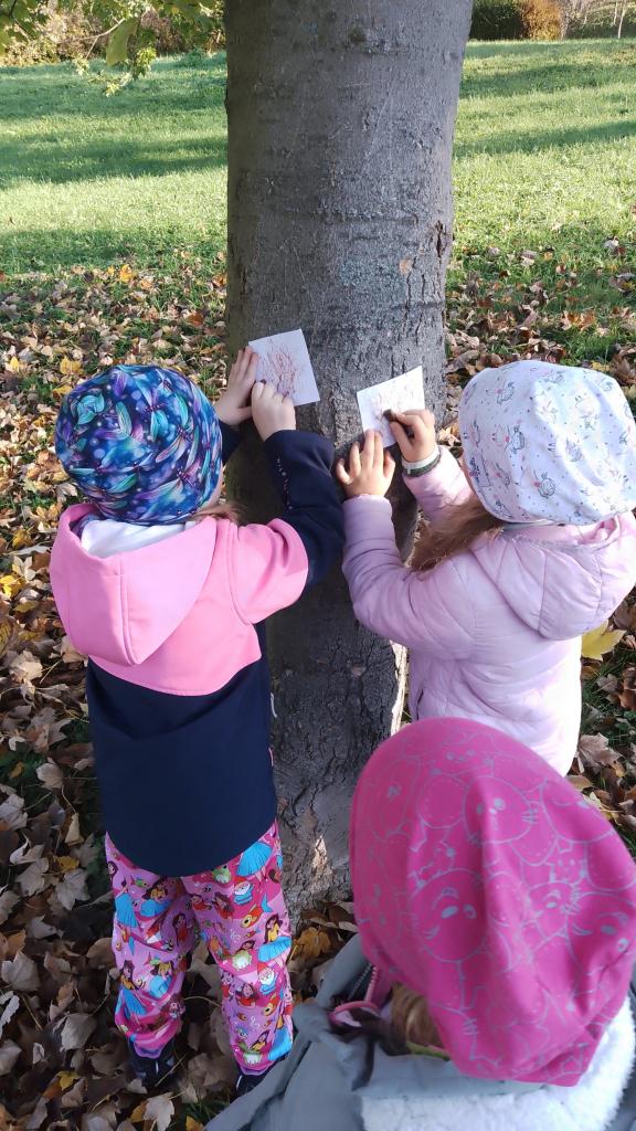 K dnešnímu pozorování stromů a listů nám vyšlo krásné počasí. Děti pozorovaly listy lupou, kůru zkoušely pomocí šrafování obtisknout na papír a vyrobit zvířátkům domečky. Za odměnu jsme házeli šiškou na cíl.