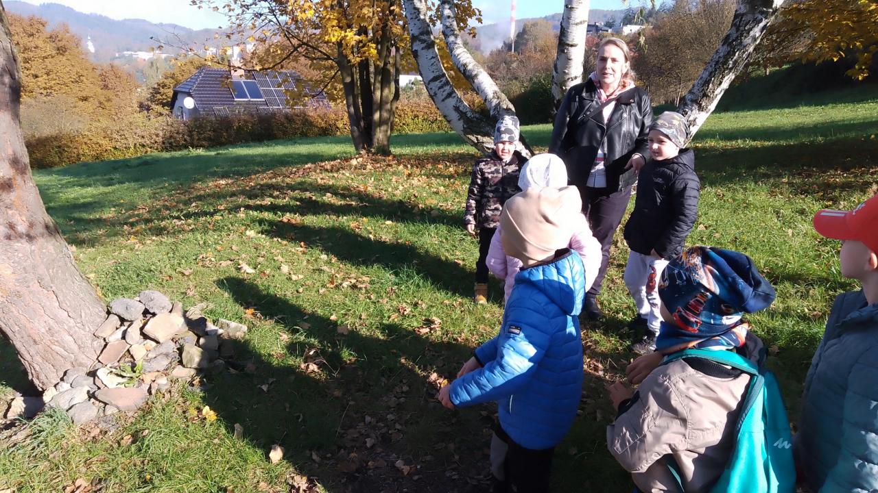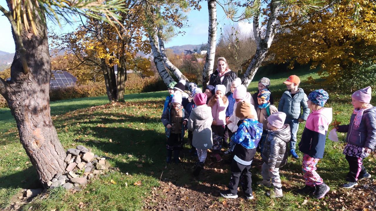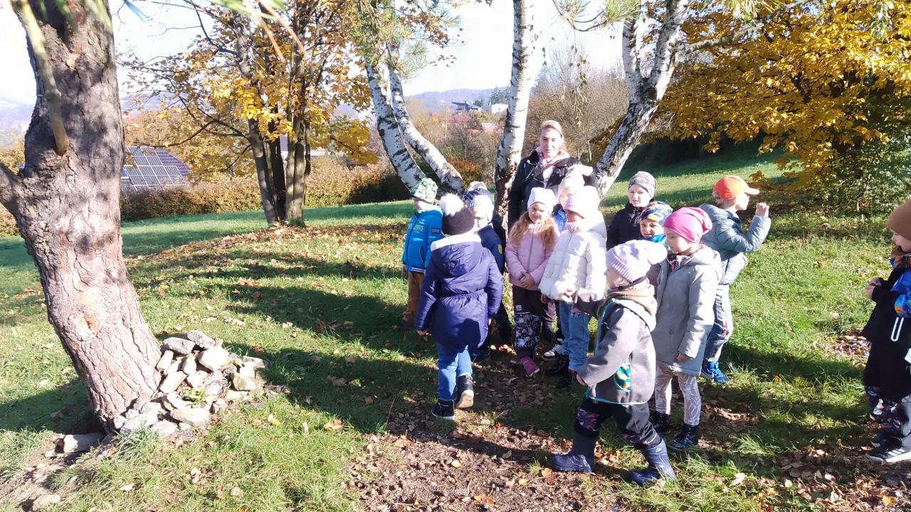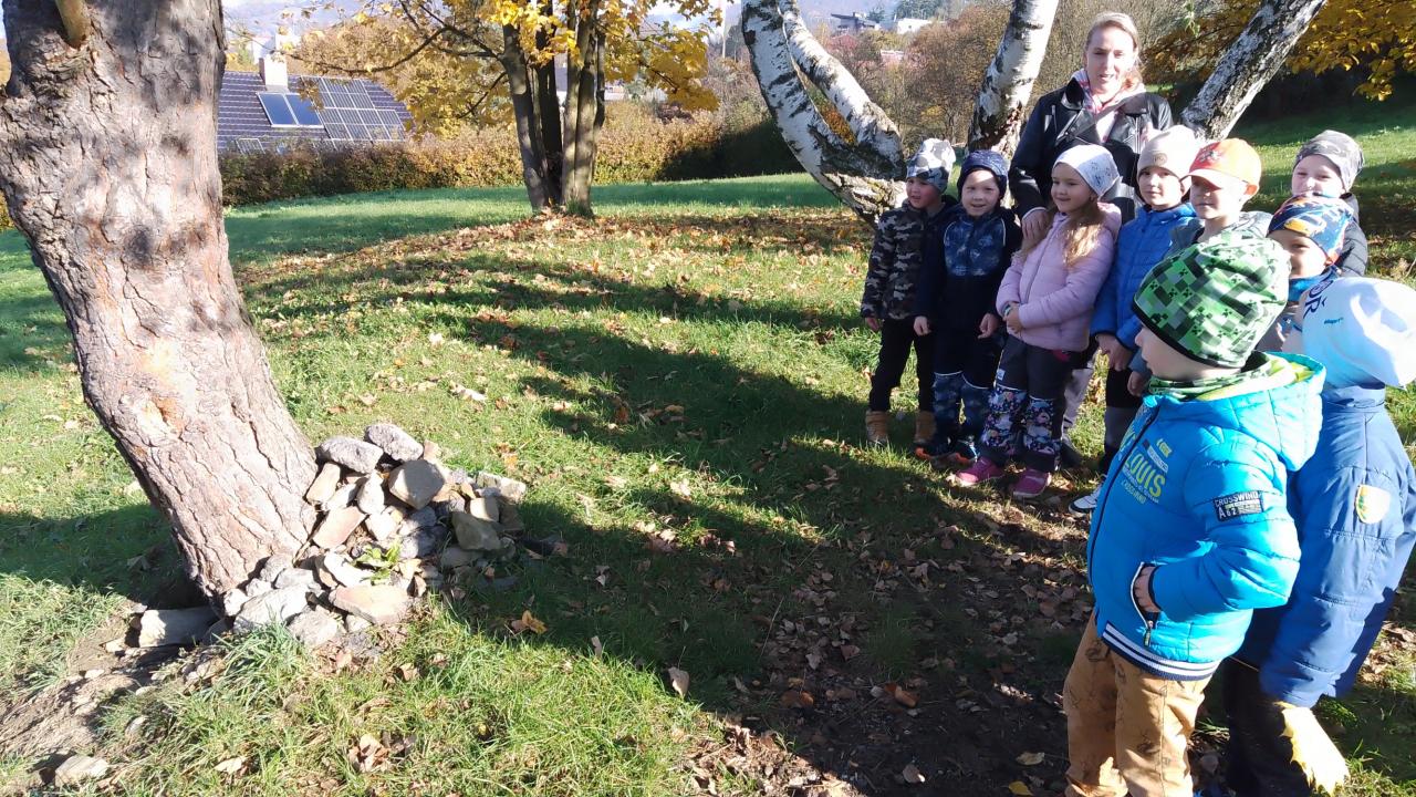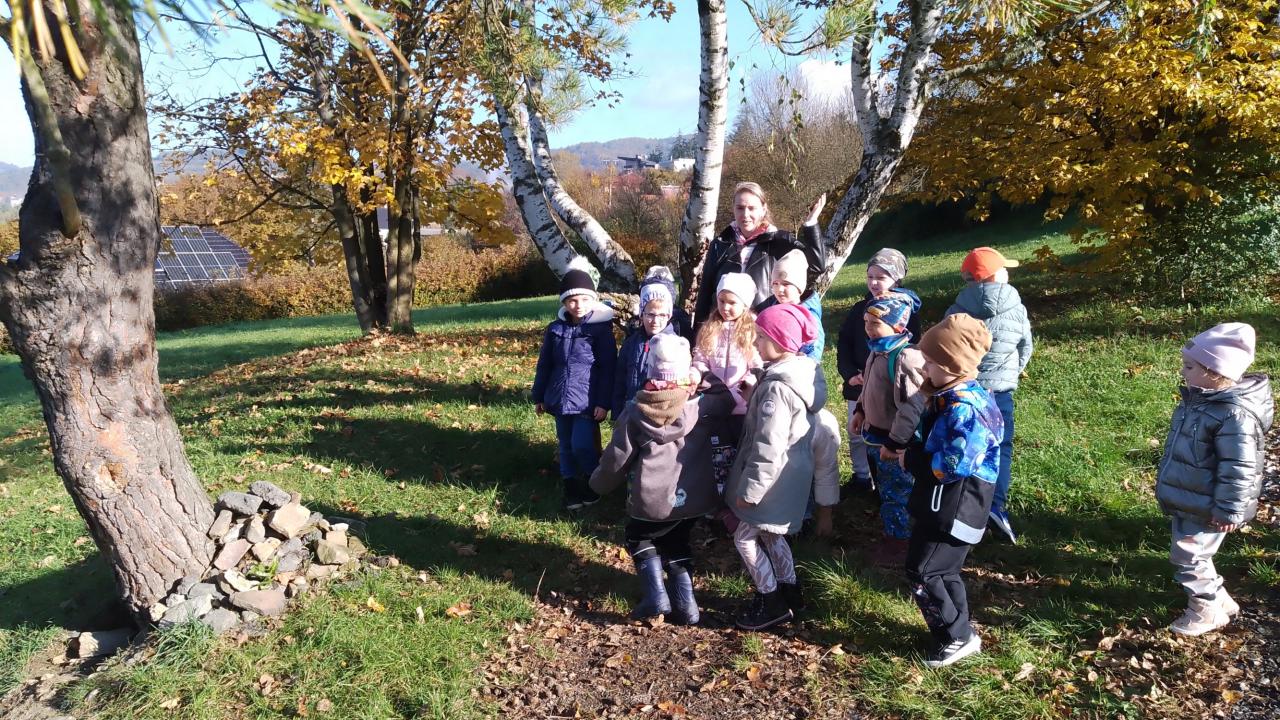 K dnešnímu pozorování stromů a listů nám vyšlo krásné počasí. Děti pozorovaly listy lupou, kůru zkoušely pomocí šrafování obtisknout na papír a vyrobit zvířátkům domečky. Za odměnu jsme házeli šiškou na cíl.