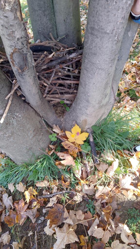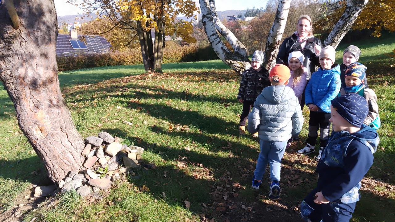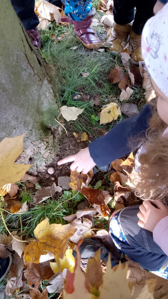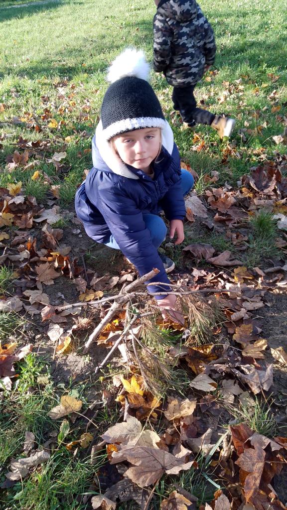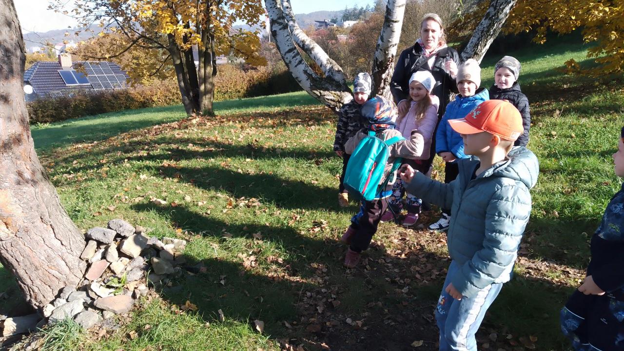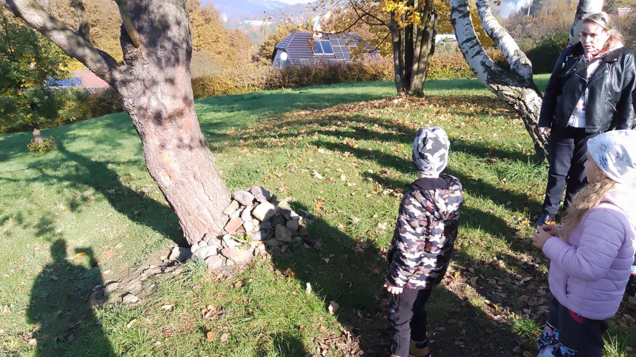 K dnešnímu pozorování stromů a listů nám vyšlo krásné počasí. Děti pozorovaly listy lupou, kůru zkoušely pomocí šrafování obtisknout na papír a vyrobit zvířátkům domečky. Za odměnu jsme házeli šiškou na cíl.
